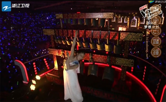 2014年10月7日,中國好聲音第三季北京總決賽在北京首都體育館成功舉辦,開場時一位身穿白衣的美麗女孩敲擊編鐘發(fā)出美妙的好聲音,這套編鐘就是由隨州市古編鐘文化發(fā)展有限公司制作的22件曾侯乙編鐘。