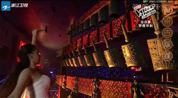 古編鐘公司受節(jié)目組委托將一套中型青銅編鐘運達(dá)活動現(xiàn)場,參加好聲音北京總決賽的開場部分,晚會以敲擊中國2400多年前的編鐘之聲開場,寓意中國文化底蘊(yùn)豐厚,好聲音自古傳今,節(jié)目由此發(fā)掘出中國眾多好聲音學(xué)員,開創(chuàng)新一代造星之路。